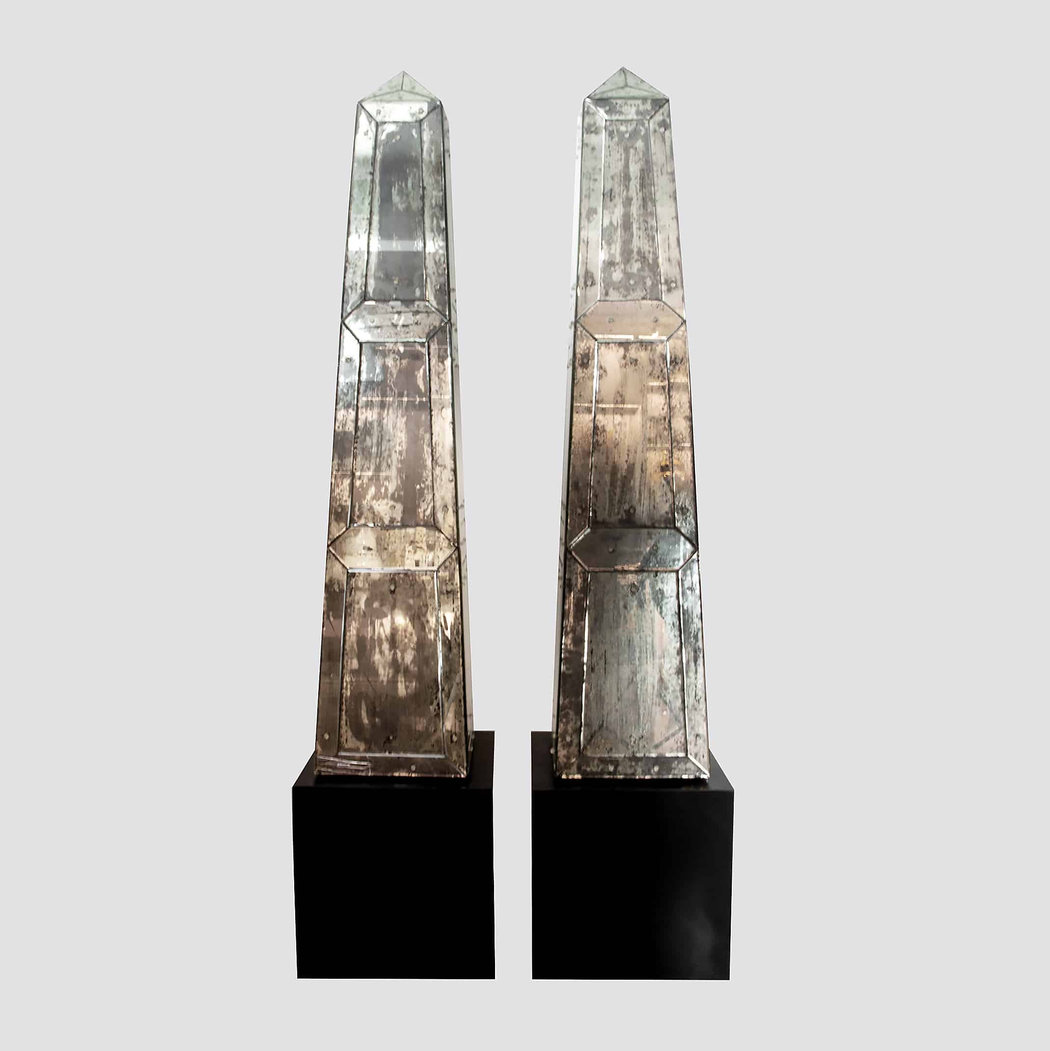 Mid-20th C. Pair of Monumental Continental Neoclassical Mirrored Obelisks raised on painted black wooden cube bases. In the manner of Serge Roche. Obelisks are 67"H