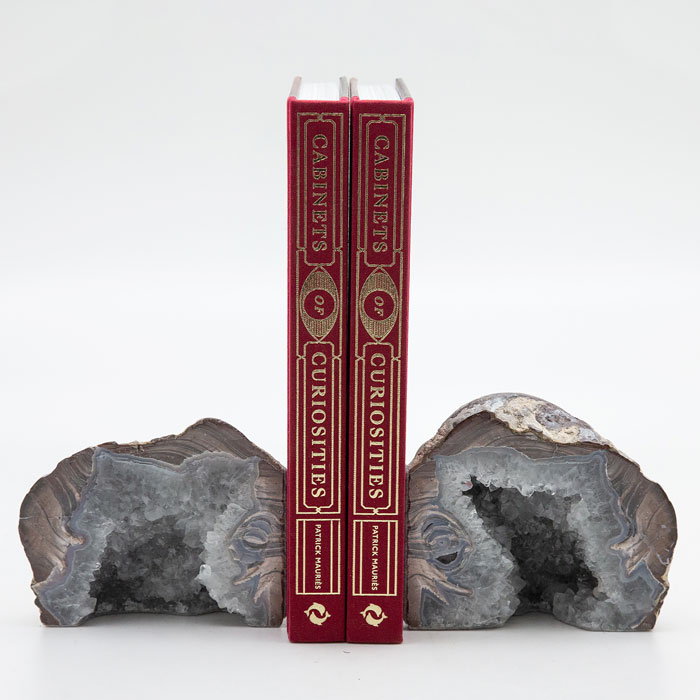 Agate, ryolite, and quartz bookends. ~ 5" H. Ryolite, agate, and quartz. These beautiful hollow geodes were formed from volcanic activity. These pieces were found in the western United States.