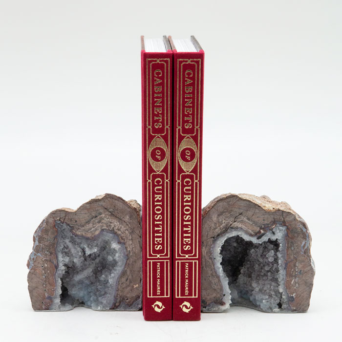 Agate, ryolite, and quartz bookends. ~ 5" H. Ryolite, agate, and quartz. These beautiful hollow geodes were formed from volcanic activity. These pieces were found in the western United States.