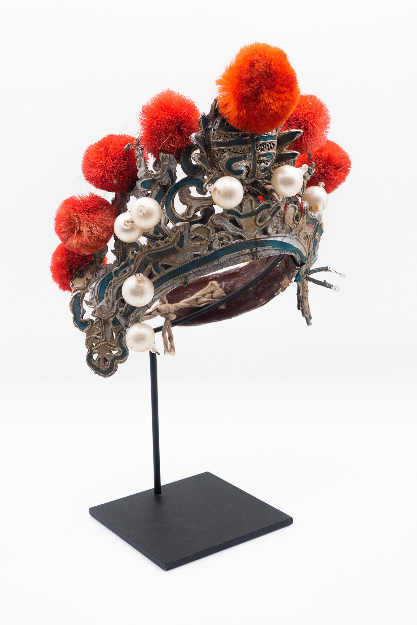 Chinese Opera Theatre Headdress, Coral Color Pom-Poms, c 1920s