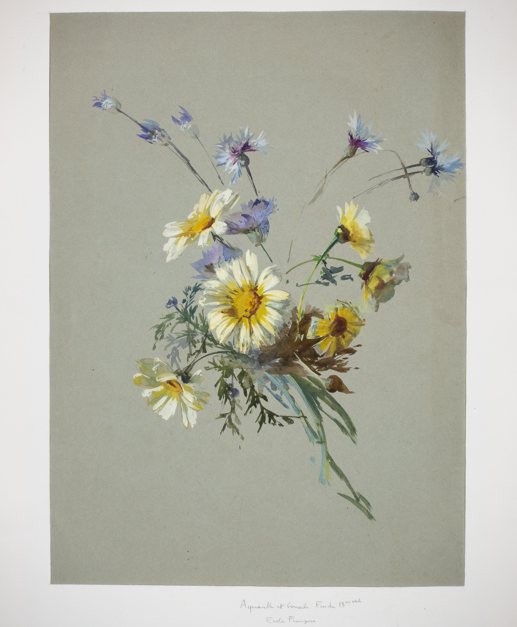 Aquarelle and gouache depiction of a bouquet of wildflowers, 19th century, French. Aquarelle is a style of painting with very thin watercolor, while gouache is a painting style using thickened opaque pigments.