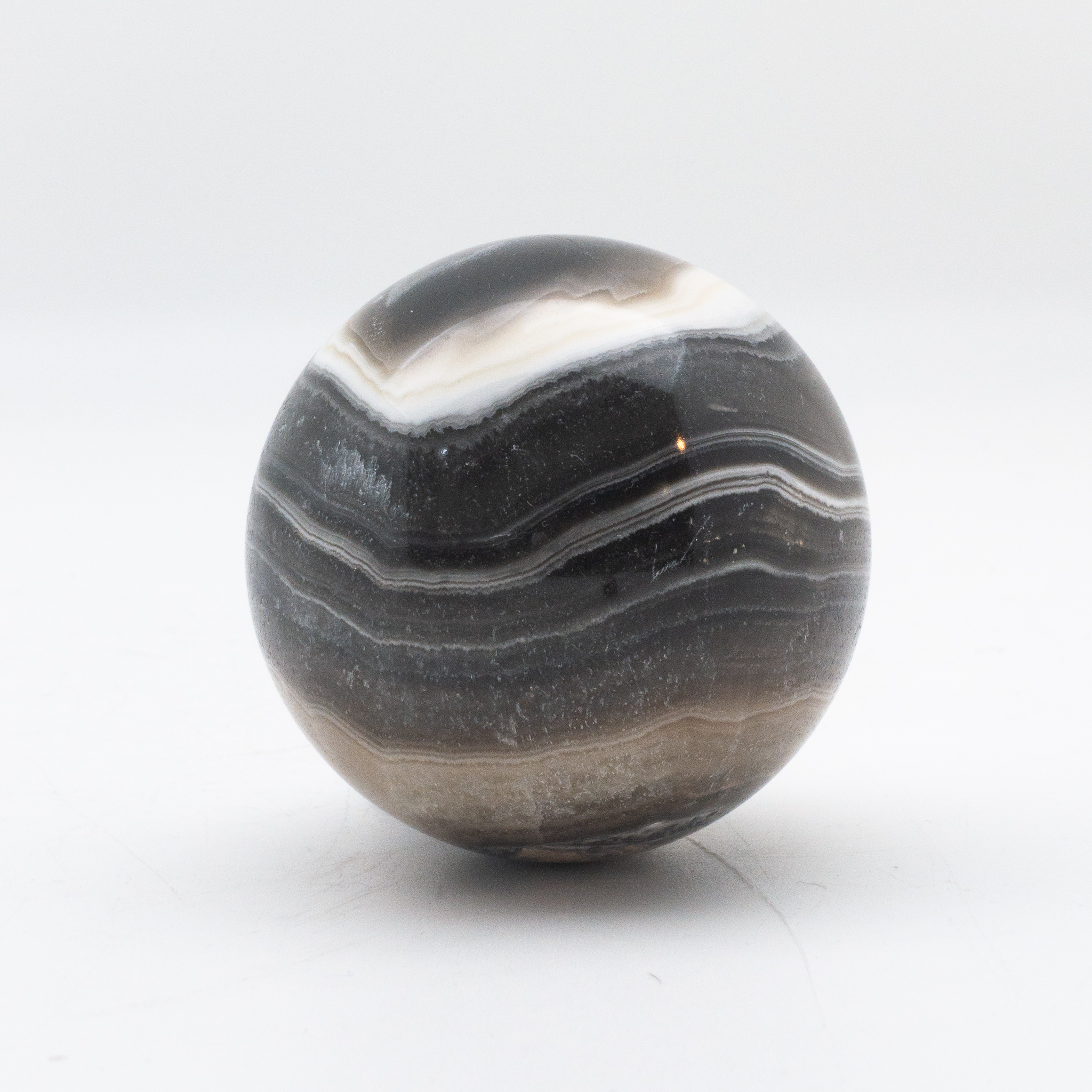 Zebra Agate Sphere. 3". Agate is the name given to varieties of banded chalcedony. It is a mineral of the quartz family. Because of the brown and white stripes, it gets its name from the Zebra. Other semiprecious spheres available.