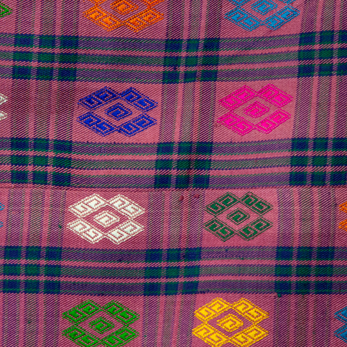 Bhutanese Silk Woven Kira Textile, Purple. Bhutanese silk woven kira textile from the Royal Weavers of Bhutan. From the royal weavers of Bhutan, this kira textile is a rectangular weaving worn as an ankle length dress by Bhutanese women. This example was originally woven for Her Majesty Gyalyum (Queen Mother) Sangay Choden Wangchuck, who founded the Royal Textile Museum and Academy in Bhutan. Probably taking almost a year to make, this exquisite example was woven on a back strap loom in three individual panels of silk then sewn together. Given the rectangular shape of the kira, it lends itself to be mounted on the wall as a decoration or used as a throw on a bed or divan.