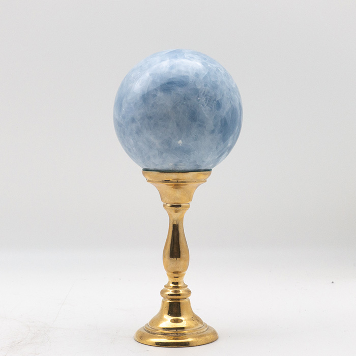 Brass-Mounted Blue Calcite Sphere, Tall. Sits on a brass stand. Stands 8.75" tall. Calcite is a member of the carbonate family. It was used in the carvings and architecture of Ancient Egypt (known there and then as alabaster). Multiple variations in size and mineral specimen available.