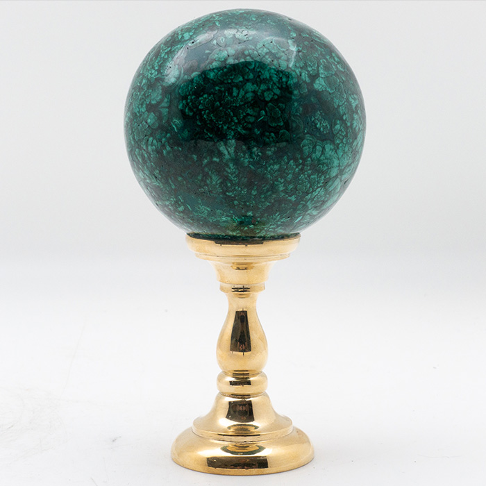 Brass-Mounted Malachite Sphere, Medium. 3.5" diameter. Malachite sphere sits on a brass stand. Stands 6.75" high. The malachite is sourced from the Congo, where is it also carved. The Congo is currently the source of the finest quality of malachite.