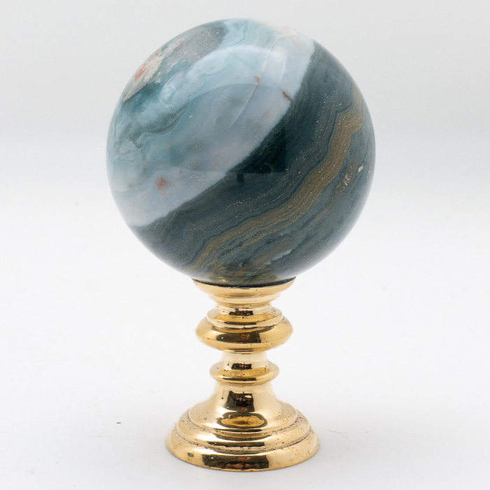 Brass-Mounted Ocean Jasper Sphere, Small. 3" diameter. On brass stand. Stands 4.5" high. Ocean jasper is also known as snakeskin jasper. Ocean Jasper is a combination of chalcedony, microcrystalline quartz as well as other minerals.