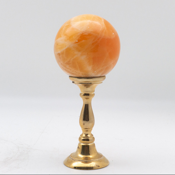 Orange calcite sphere mounted on a brass stand. Calcite is a member of the carbonate family, and was used in the carvings and architecture of Ancient Egypt (known there and then as alabaster).