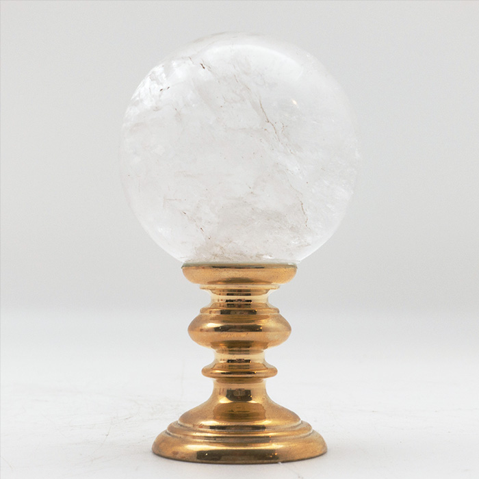 Brass-Mounted Rock Crystal Sphere, Small. Mounted on a brass stand. Sits 4.5" tall. Rock crystal is a form of quartz. It has been used in jewelry and ornaments since antiquity, and is the purest form of quartz discovered. Multiple variations in size and mineral specimen available (all pictured).