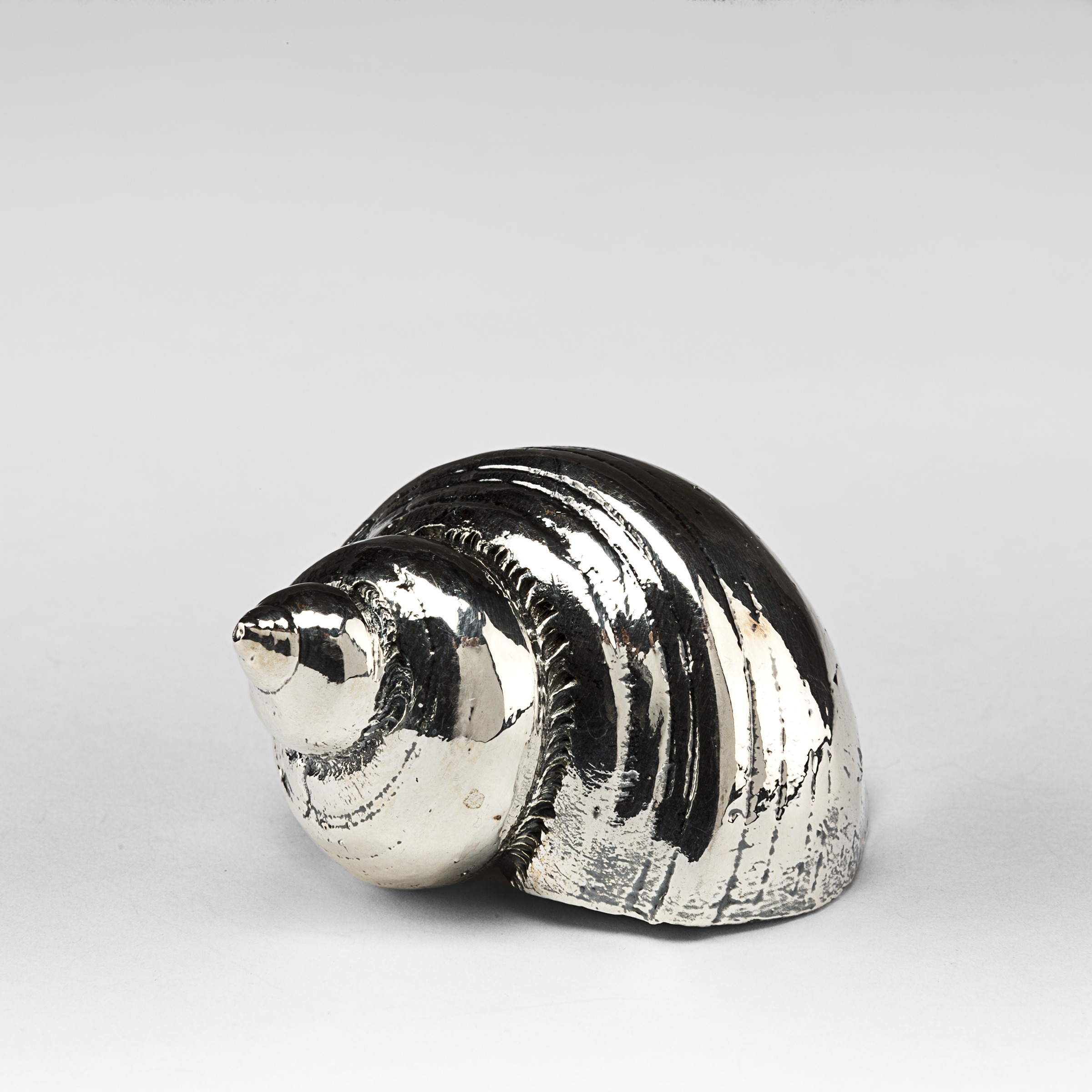 Silvered Burgus Lineate Shell. 2". Creel and Gow has been working with the same atelier in Rome, Italy for over 20 years to make our signature silvered shells. Our workshop has been operated by the same family for generations. For decades, this family has also done restoration work on silver pieces for the Vatican.