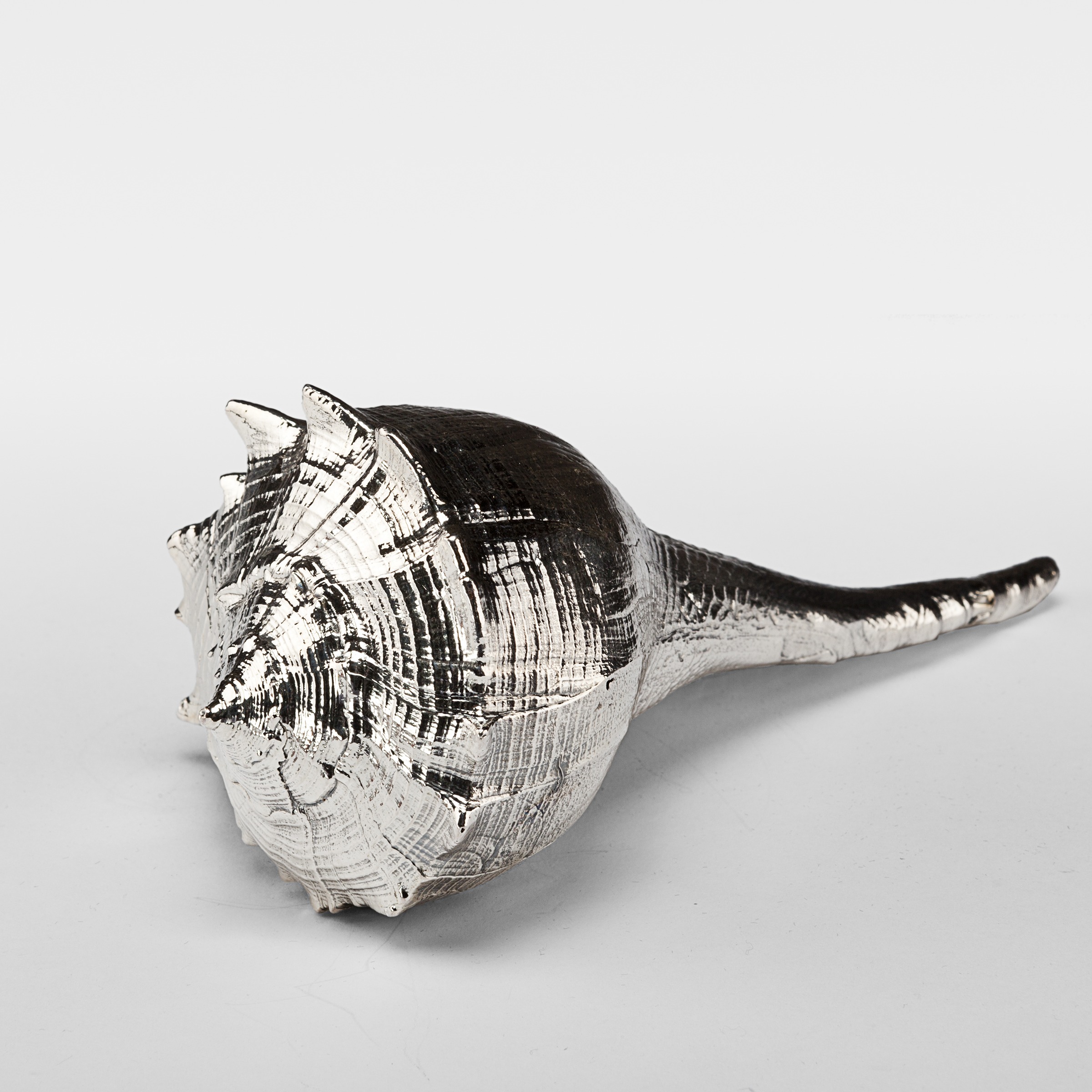 Silvered Busycon Shell. Available in 6" and 8". Creel and Gow has been working with the same atelier in Rome, Italy for over 20 years to make our signature silvered shells. Our workshop has been operated by the same family for generations. For decades, this family has also done restoration work on silver pieces for the Vatican.