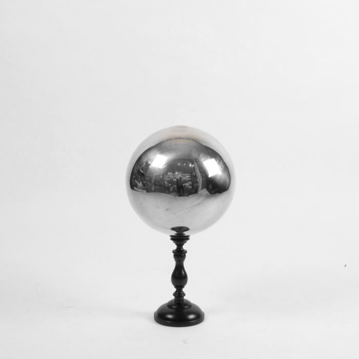 A stainless steel butler's ball mounted on a turned wooden base. A butler's ball allows a butler to survey a dinner party's progress without having to stare at guests by looking into its wide reflection.