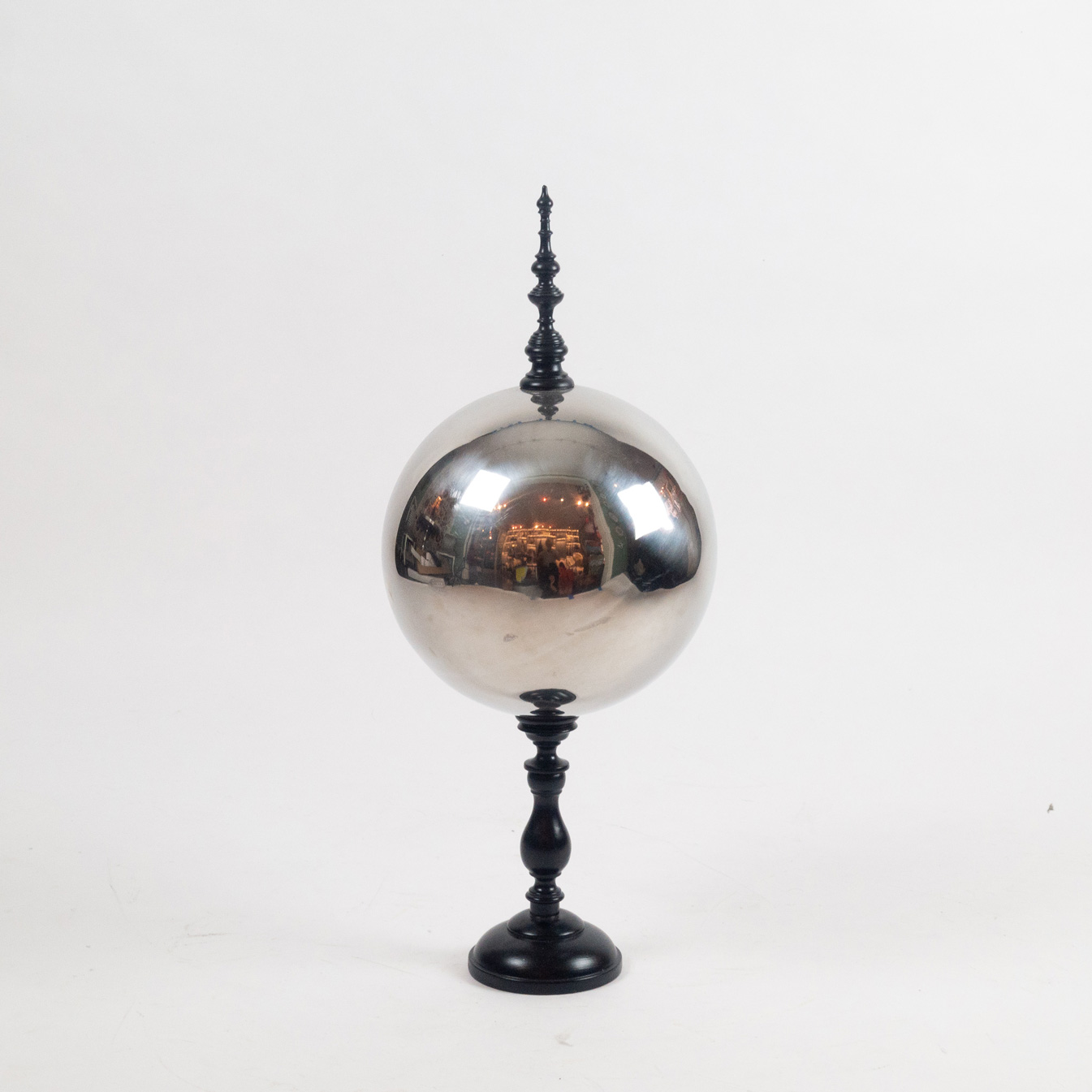 Butler's Ball with Finial. A stainless steel butler's ball with wood finial mounted on a turned wooden base. A butler's ball allows a butler to survey a dinner party's progress without having to stare at guests by looking into its wide reflection.