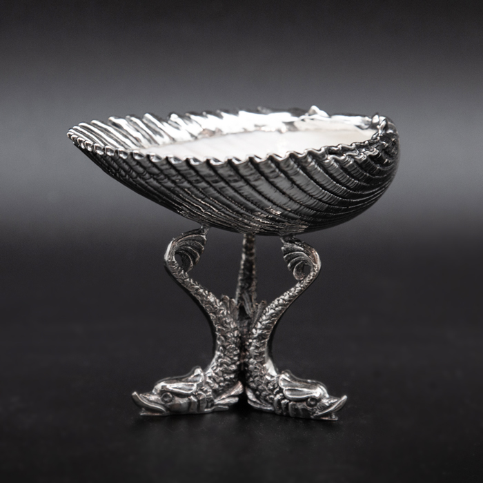 Cardium Bernini Silver Mounted Caviar Dish. 4". Created with natural shell. Each is unique. Creel and Gow has been working with the same atelier in Rome, Italy for over 20 years to make our signature silvered shells. Our workshop has been operated by the same family for generations. For decades, this family has also done restoration work on silver pieces for the Vatican.