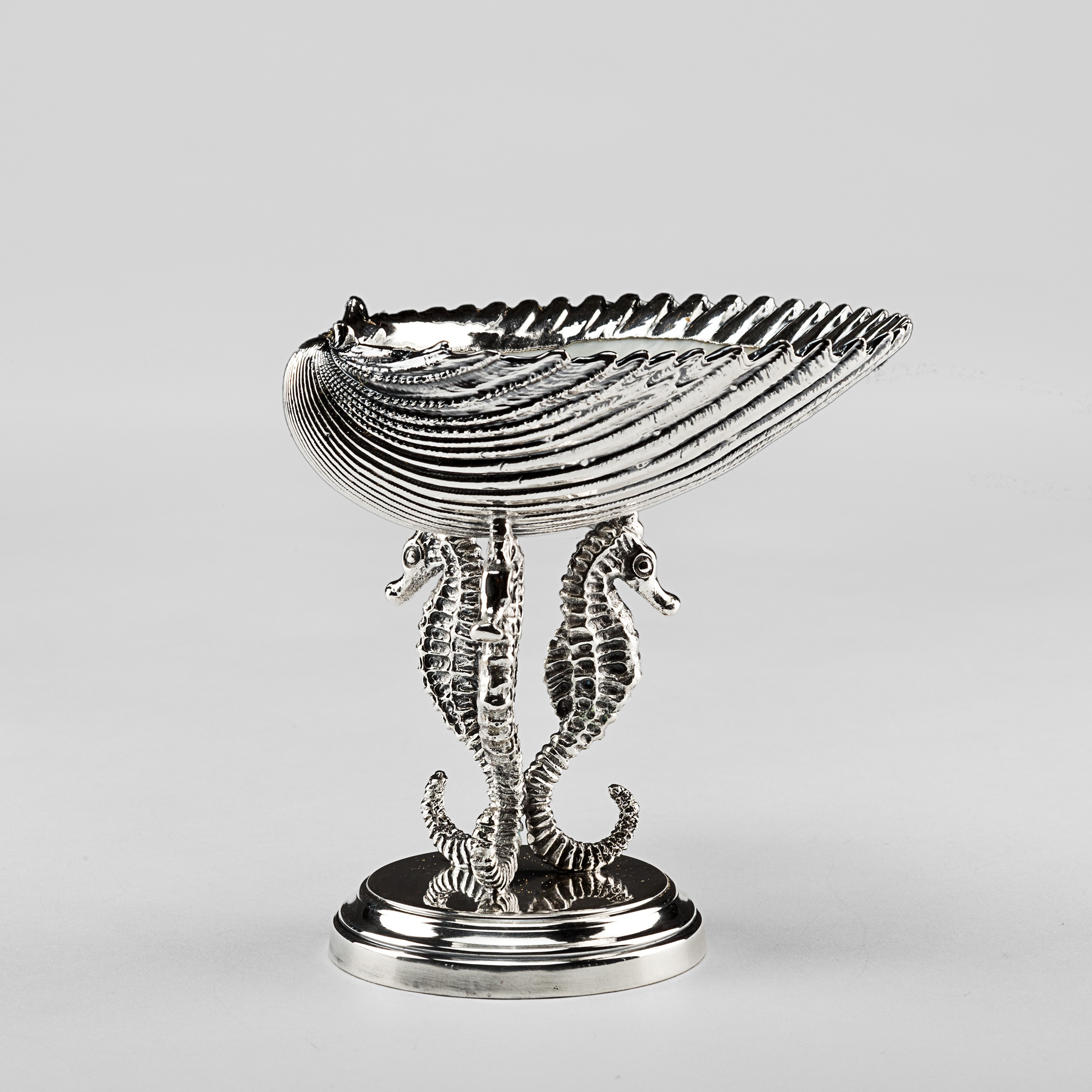 Mounted Silvered Cardium Bernini. 4". Created with natural shell. Each is unique. Creel and Gow has been working with the same atelier in Rome, Italy for over 20 years to make our signature silvered shells. Our workshop has been operated by the same family for generations. For decades, this family has also done restoration work on silver pieces for the Vatican.