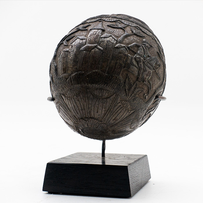 19th century carved Bugbear coconut mounted on a 2.5" H wood and metal stand. 'Bugbear’ coconuts were carved on long voyages by sailors who had visited the Tropics and collected the 'green nuts', which were easier to carve while still young and fresh. French prisoners of war would also carve them to depict life back home. They were also used as portable gunpowder receptacles.