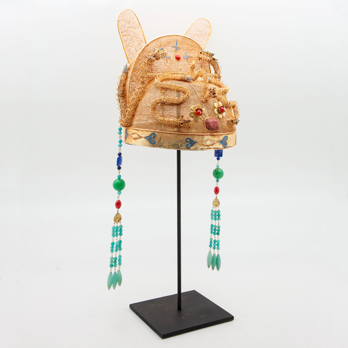 Chinese Opera Theatre Headdress, Ears and Dragons. Chinese opera theatre headdress with dragons, ears, beaded tassels, and red stones. Mid 20th century, mounted on a custom black painted metal base. 20.5" Height