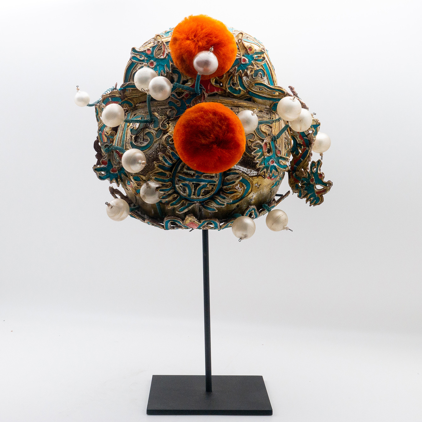 Vintage Chinese opera theatre headdress in turquoise and gold colors with faux pearls and orange pom-poms, early 20th century, mounted on a custom, black painted metal base.