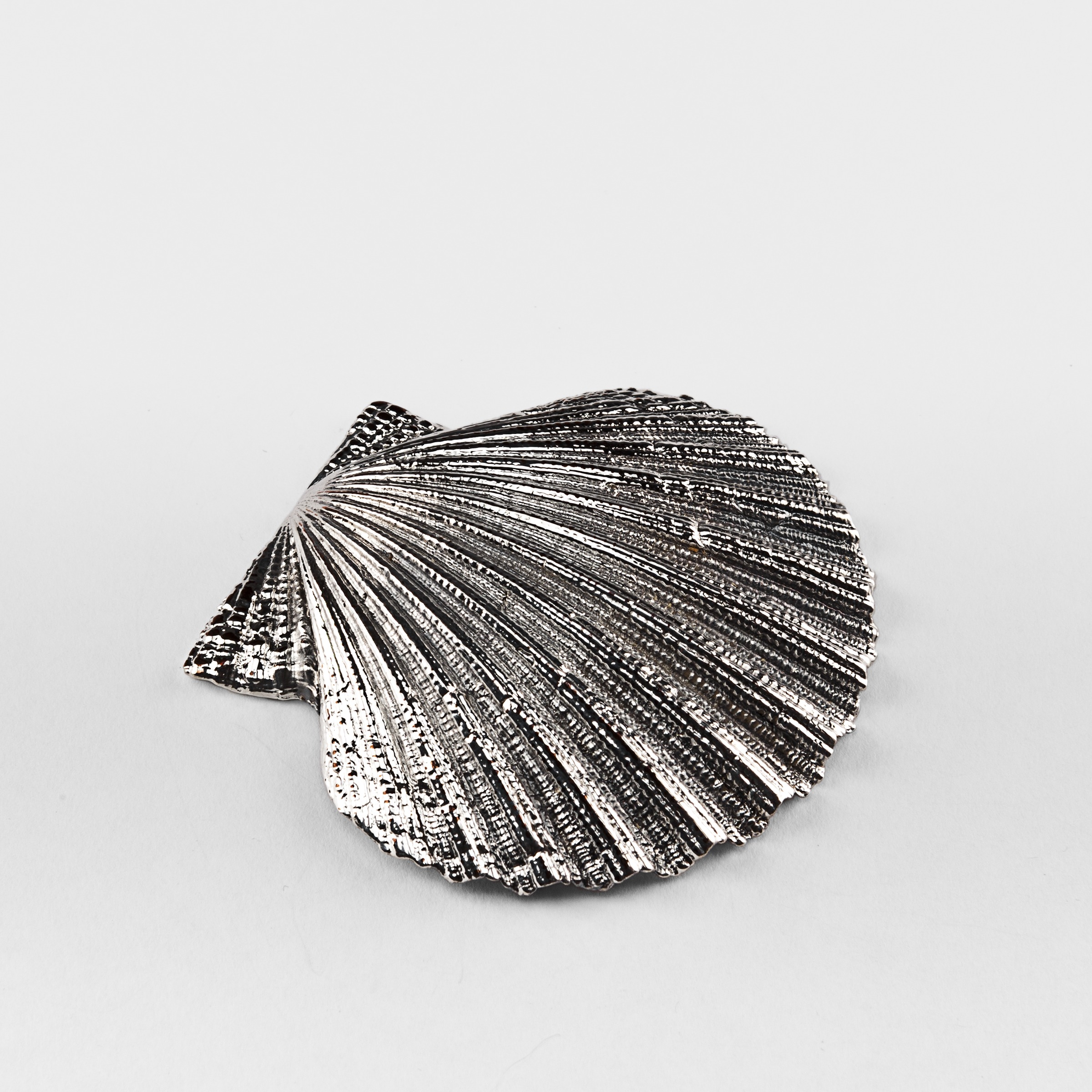 Cockle shell fully silvered 2". Creel and Gow has been working with the same atelier in Rome, Italy for over 20 years to make our signature silvered shells. Our workshop has been operated by the same family for generations. For decades, this family has also done restoration work on silver pieces for the Vatican.