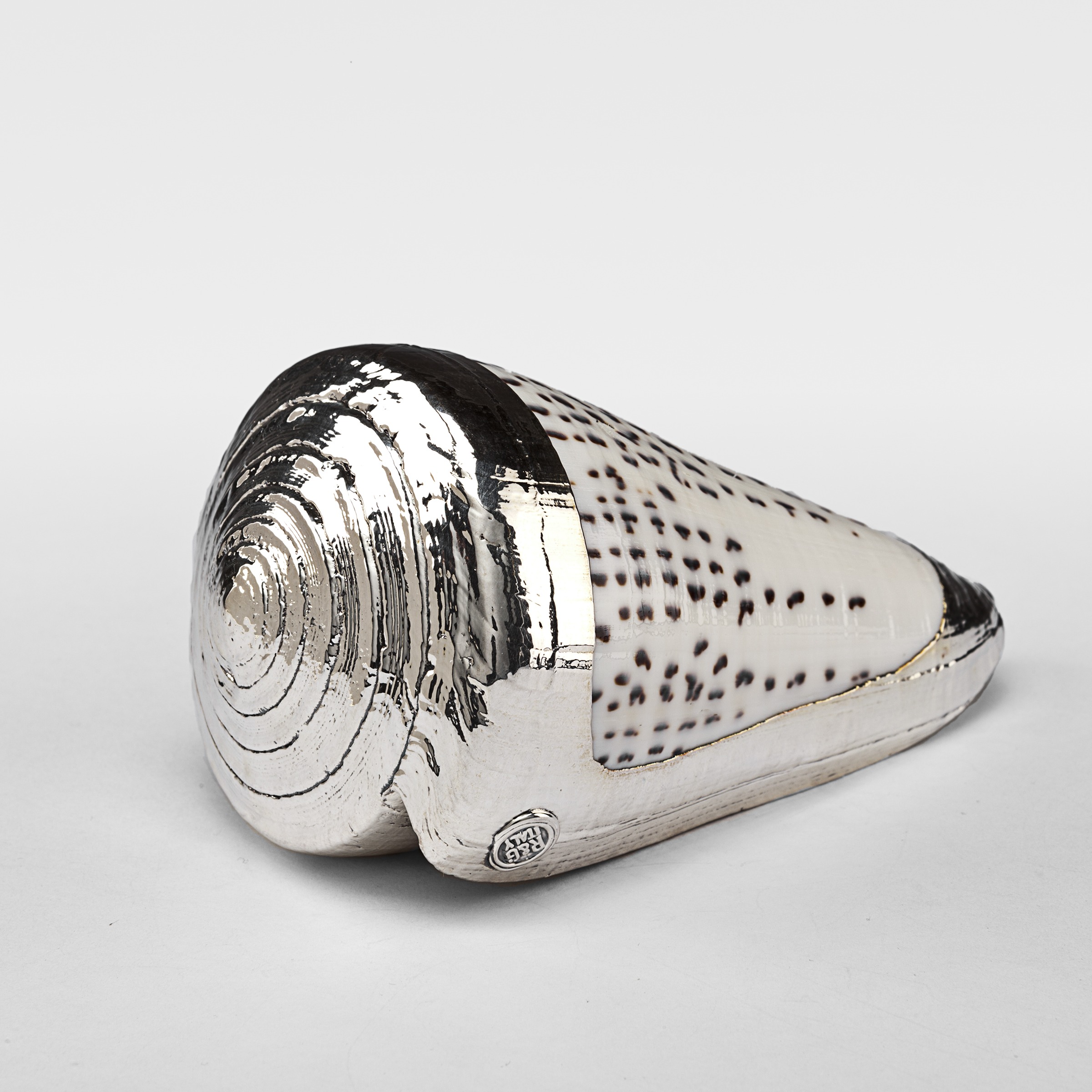 Partially Silvered Conus Leopard Shell. Available in 3" and 4". Made from natural shell. Creel and Gow has been working with the same atelier in Rome, Italy for over 20 years to make our signature silvered shells. Our workshop has been operated by the same family for generations. For decades, this family has also done restoration work on silver pieces for the Vatican.