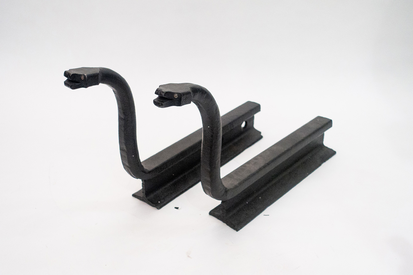 Wonderful pair of antique folk art snake andirons with inset glass eyes. They were blacksmith-made, crafted from hand-hammered wrought iron. The artist used pieces of railroad tracks to build a one of a kind set of andirons, built to last several lifetimes. No damage, clean and ready to use.