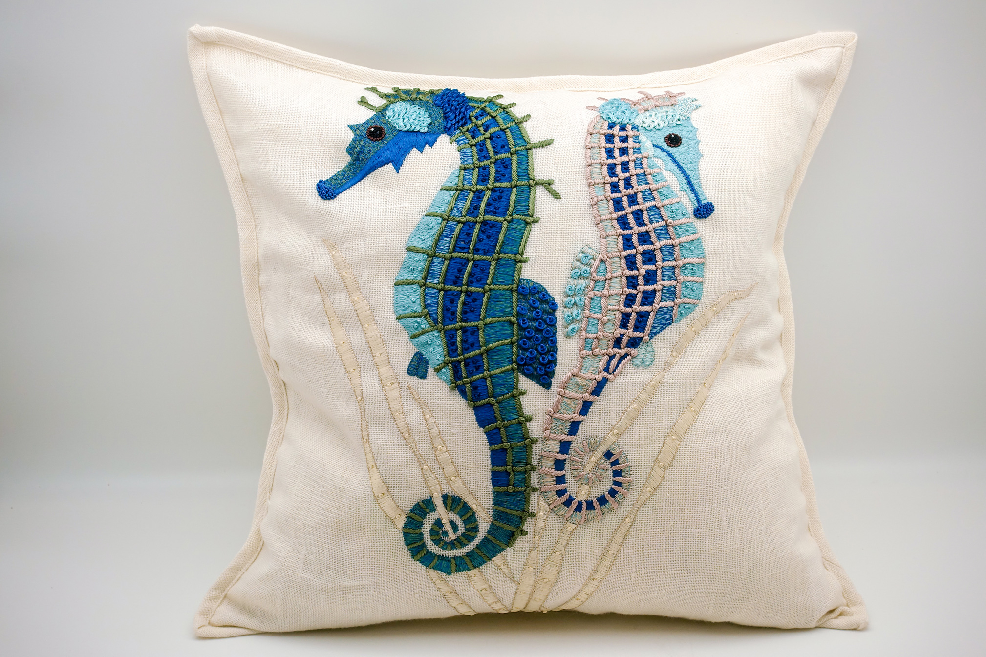 Due to its success, Embroidered Linen Seahorse Pillow Cover is currently not available.