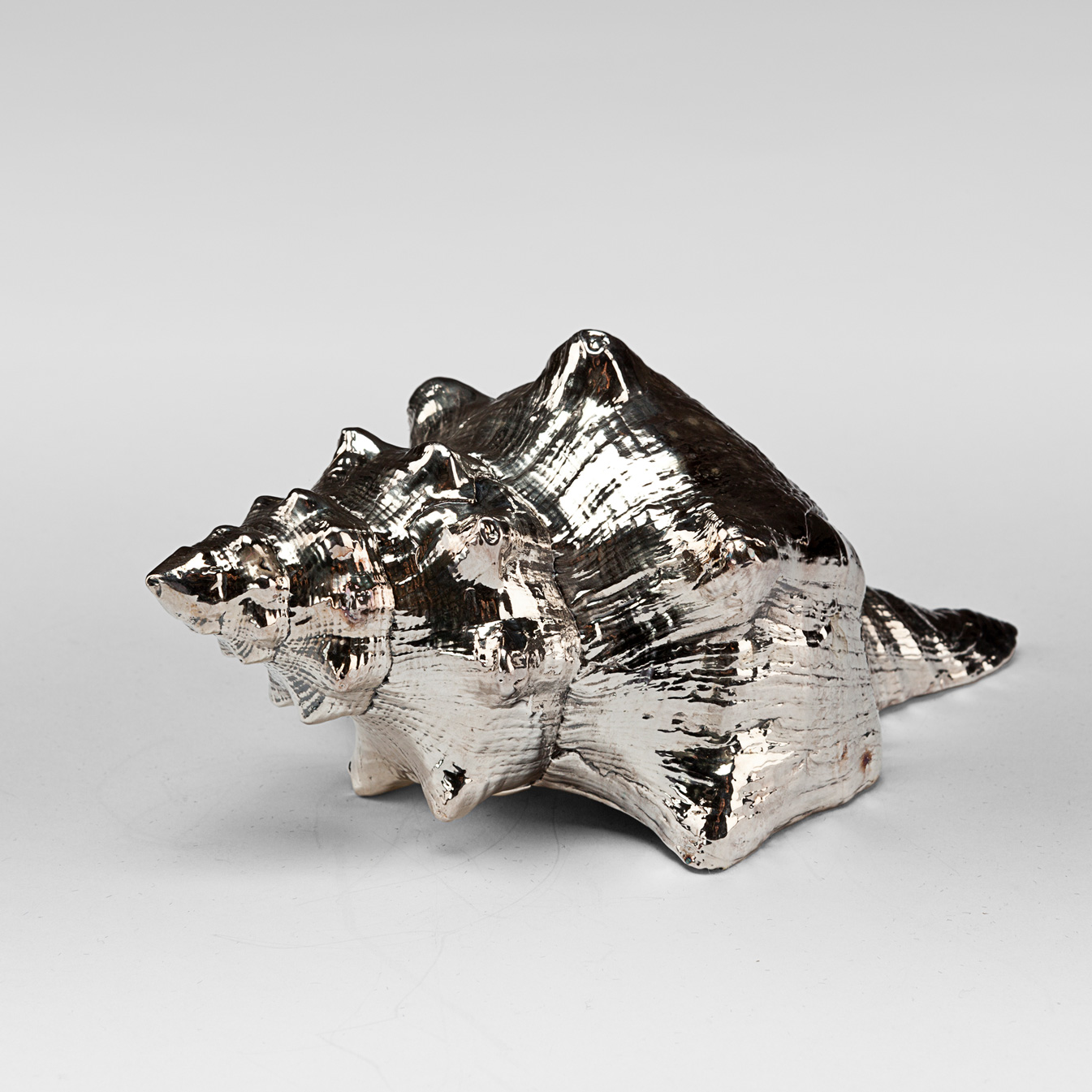 Silvered Fasciolaria Shell. Available in 5" and 6". Each shell is unique. Creel and Gow has been working with the same atelier in Rome, Italy for over 20 years to make our signature silvered shells. Our workshop has been operated by the same family for generations. For decades, this family has also done restoration work on silver pieces for the Vatican.