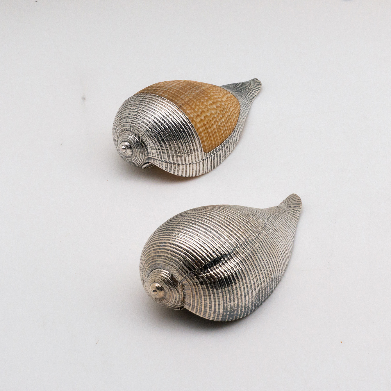 Silvered Fig Shell. Available fully silvered 5" and partially silvered 4". Each shell is unique: Creel and Gow has been working with the same atelier in Rome, Italy for over 20 years to make our signature silvered shells. Our workshop has been operated by the same family for generations. For decades, this family has also done restoration work on silver pieces for the Vatican.
