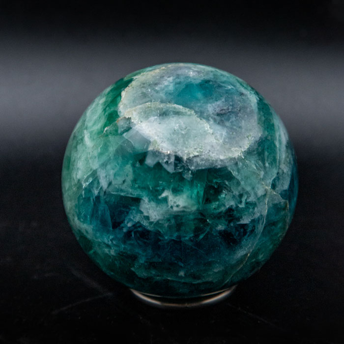 Green fluorite sphere specimen, 3" diameter. Known as "the most colorful mineral in the world", fluorite commonly features bands of purple, green, yellow, or blue. It is colorless in pure form, though specimens with pink, red, white, brown and black also occur.