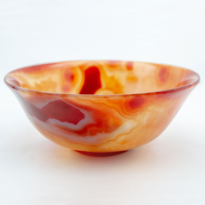 Hand caved orange agate semi-precious stone bowl, measures: 6" diameter x 2.5" height. According to modern healers who use stones in healing, orange agate is a stabilizing stone. It generates self-acceptance creating a sense of confidence. It offers calm, soothing energy that brings about balance, harmony and strength.