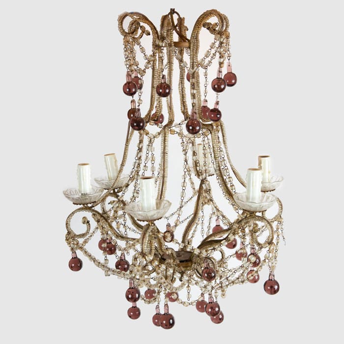 Italian Beaded Glass Purple Drop Chandelier. Italian gilt metal birdcage frame with clear glass beads, ornamented by purple glass hanging drops. 30" x 18" x 18"