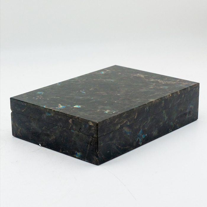 Labradorite hinged box. Labradorite displays a distinctive iridescent optical effect known as labradorescence, similar to the glint of a butterfly's wing.