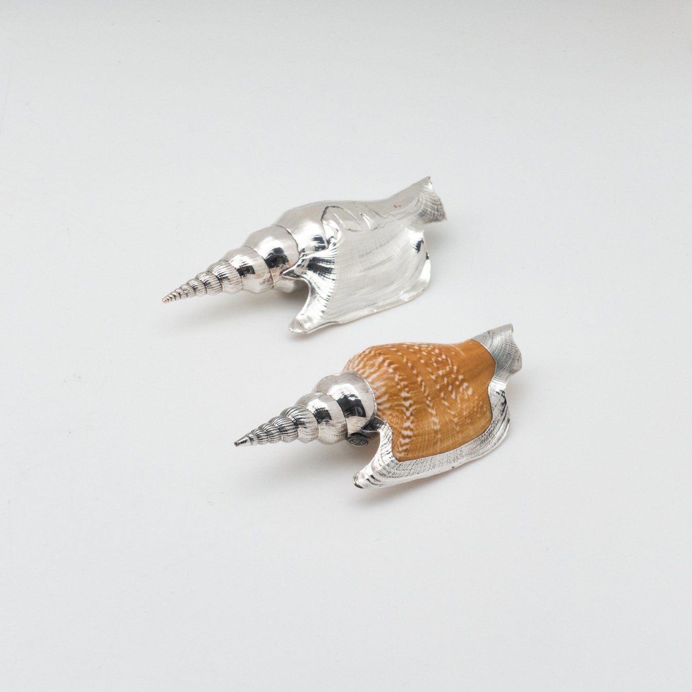 Silvered Lister's Conch. Available in fully silvered shell 4" and partially silvered shell 5". Made from natural shell. Each shell is unique. Creel and Gow has been working with the same atelier in Rome, Italy for over 20 years to make our signature silvered shells. Our workshop has been operated by the same family for generations. For decades, this family has also done restoration work on silver pieces for the Vatican.