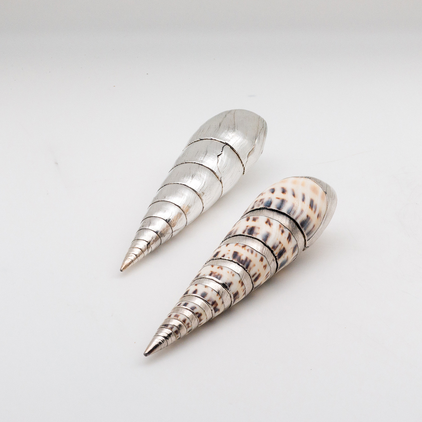 Silvered Marlinspike Shell. Available fully silvered 5" and partially silvered shell 7". Made from natural shell. Creel and Gow has been working with the same atelier in Rome, Italy for over 20 years to make our signature silvered shells. Our workshop has been operated by the same family for generations. For decades, this family has also done restoration work on silver pieces for the Vatican.