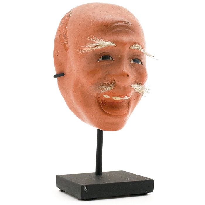 Miniature Japanese Papier-Mâché (19th Century) Iki Ningyo mask or sometimes referred to as Noh mask, mounted on custom painted metal base.Trimmed with natural hair and glass, painted glass eyes.