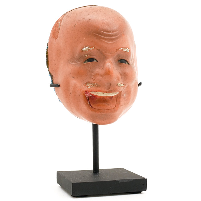 Miniature Japanese Papier-Mâché (19th Century) Iki Ningyo mask or sometimes referred to as Noh mask, mounted on custom painted metal base.  Trimmed with natural hair and glass, painted glass eyes.
