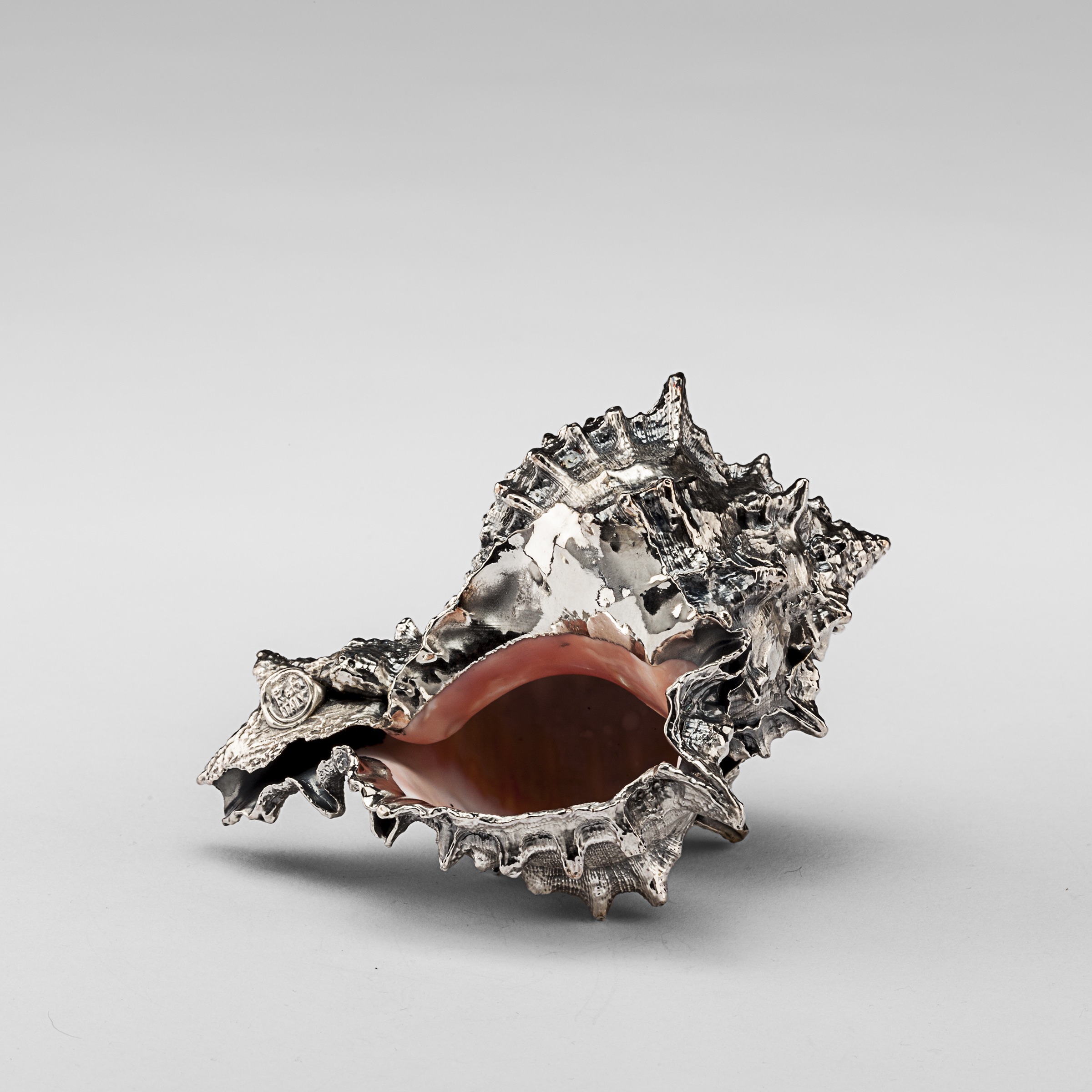 Silvered Murex Boca Rosa Shell. 4". Made from natural shell. Each shell is unique. Creel and Gow has been working with the same atelier in Rome, Italy for over 20 years to make our signature silvered shells. Our workshop has been operated by the same family for generations. For decades, this family has also done restoration work on silver pieces for the Vatican.