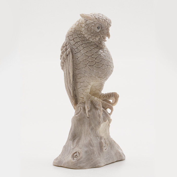 Moose antler carving of a horned owl. This is a one of a kind object. The moose antler was sourced in North America and carved in Indonesia. Quality of ivory, but with sustainability, as the moose naturally shed their antlers.