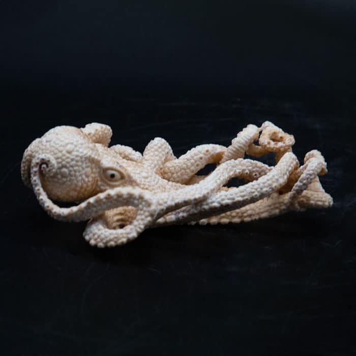 Octopus Moose Antler Carving. Detailed moose antler carving of an octopus, from Indonesia. This is a one of a kind object. The moose antler was sourced in North America and then sent to Asia for carving. Quality of ivory, but with sustainability, as the moose naturally shed their antlers. 5.5" Length
