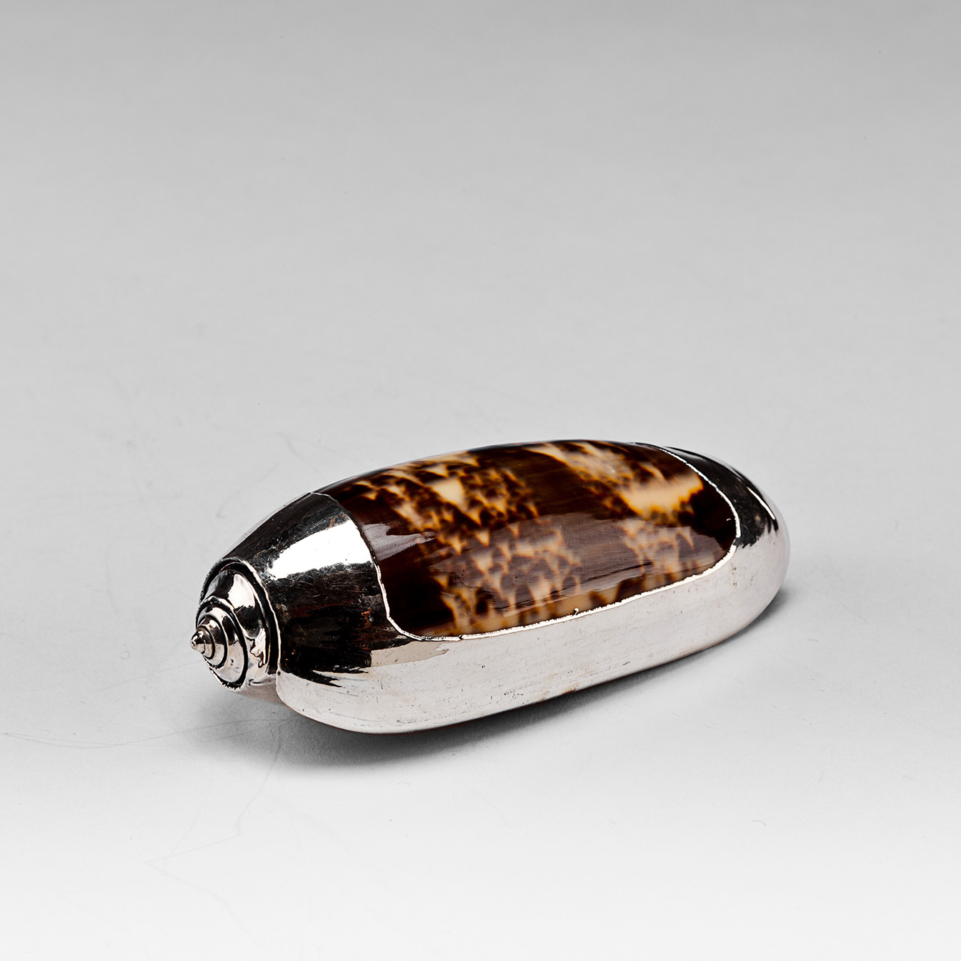 Partially Silvered Olive Shell. 3". Shells are natural. Each shell is unique and made by hand. Creel and Gow has been working with the same atelier in Rome, Italy for over 20 years to make our signature silvered shells. Our workshop has been operated by the same family for generations. For decades, this family has also done restoration work on silver pieces for the Vatican.