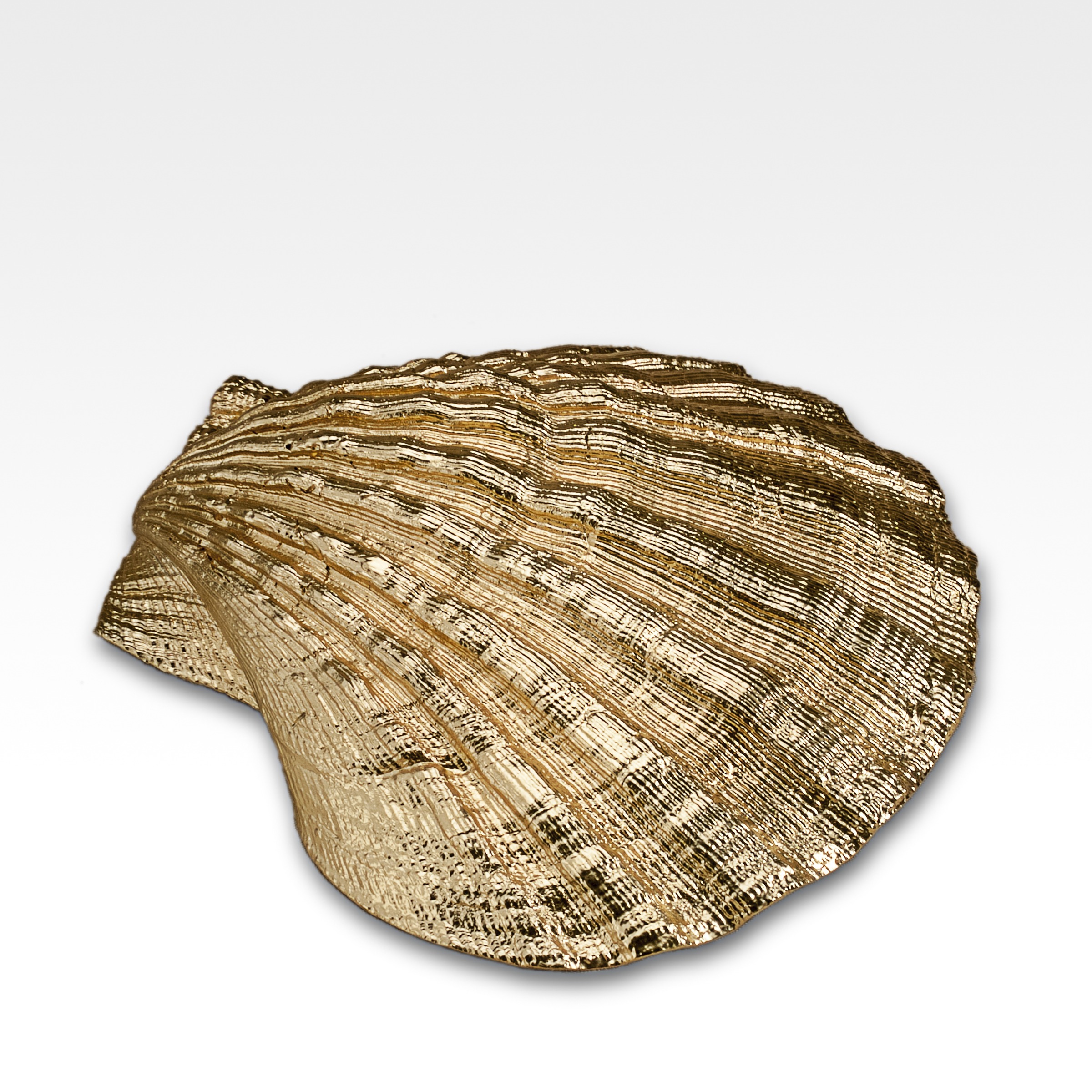 Gilded Pecten Shell. Available in 5"and 6". Creel and Gow has been working with the same atelier in Rome, Italy for over 20 years to make our signature silvered shells. Our workshop has been operated by the same family for generations. For decades, this family has also done restoration work on silver pieces for the Vatican.