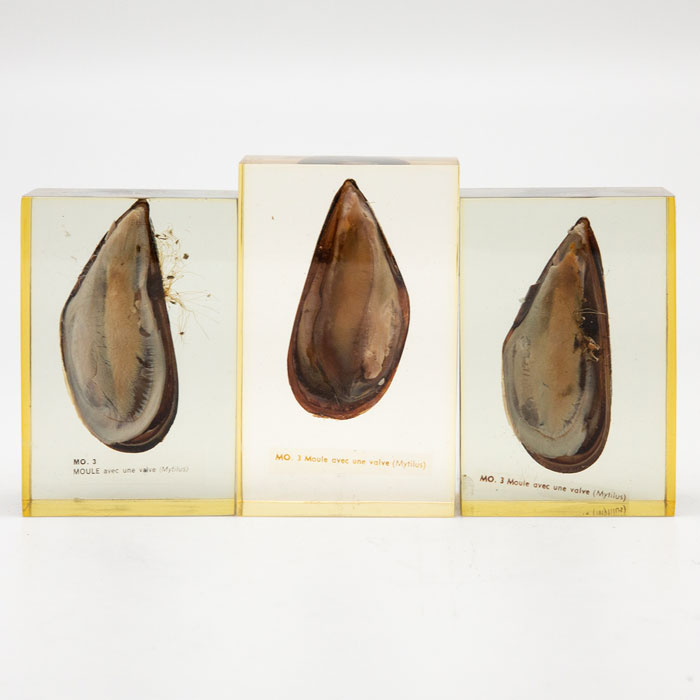 Pierre Giraudon Set of Three Mussels Encased in Resin. " MO.3: Moule avec une valve (Mytilus)" One measures 4 and 3/8" x 1 and 1/2" x 2 and 3/4". Other two measure 3 and 7/8" x 1 and 1/2" x 2 and 3/4"