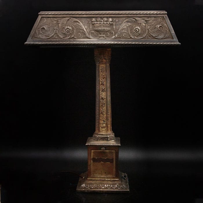 Late 19th C. Renaissance Revival Library Lamp with trapezoidal shade decorated with acanthus scrolls and urns. Base ornamented with classical masks, and ivy, and with the quote "Those that are greedy of praise prove that they are poor in merit." Includes secret compartment! 19.5"H