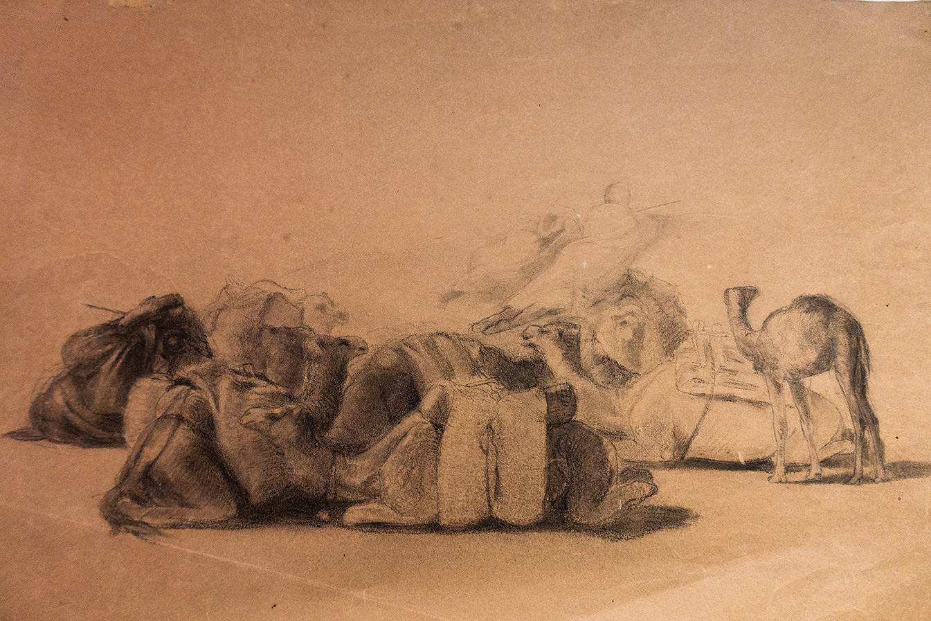 Resting camel drawing on paper by George Washington, stamped "G. Washington". Georges Washington (1827-1901) is considered one of France's most successful 19th century Orientalist painters, renowned for his vibrant and animated scenes of Arab cavaliers and huntsmen set in Algeria, Morocco, and Turkey. His exhibited and commissioned works are now part of many important public and private collections, enthusiastically praised by connoisseurs of the European Orientalist School for their virtuosity.