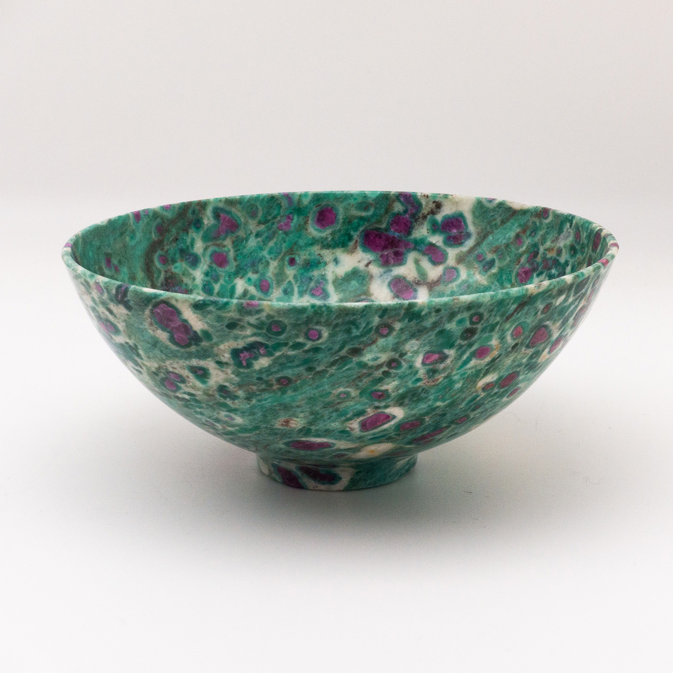 Ruby in fuchsite bowl. 6". Fuchsite is a green variety of muscovite mica that on rare instances contains tiny red crystals as seen here. Crafted by artisans in India.