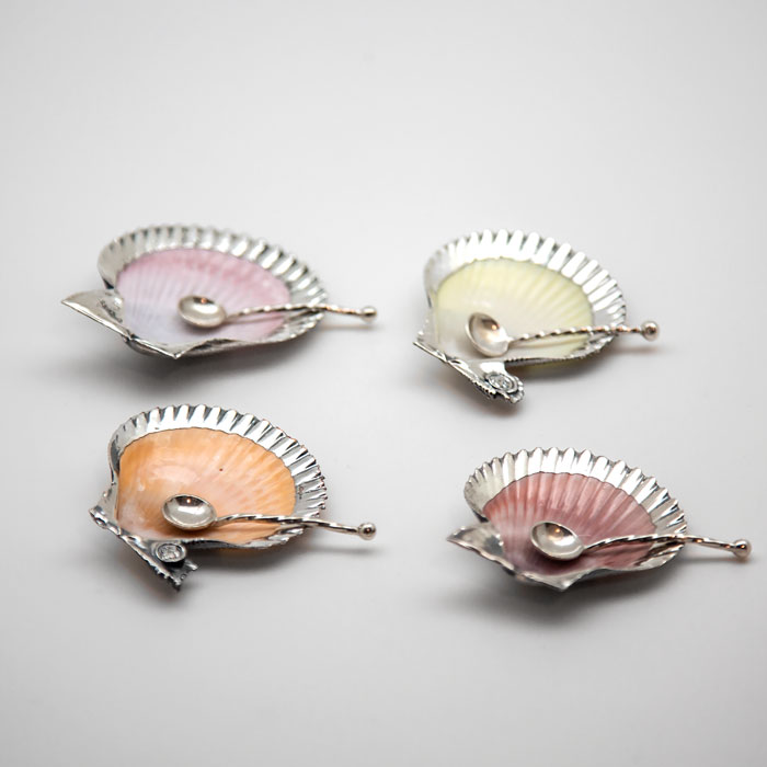 Silver Salt Cockle Set with Sterling Silver Spoons. Four cockles of varying colors. Partially silvered with sterling silver spoons 2". Creel and Gow has been working with the same atelier in Rome, Italy for over 20 years to make our signature silvered shells. Our workshop has been operated by the same family for generations. For decades, this family has also done restoration work on silver pieces for the Vatican.