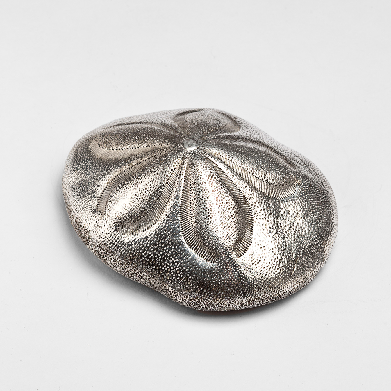 Silvered Sand Dollar Shirley. 4". Made from natural shell. Creel and Gow has been working with the same atelier in Rome, Italy for over 20 years to make our signature silvered shells. Our workshop has been operated by the same family for generations. For decades, this family has also done restoration work on silver pieces for the Vatican.