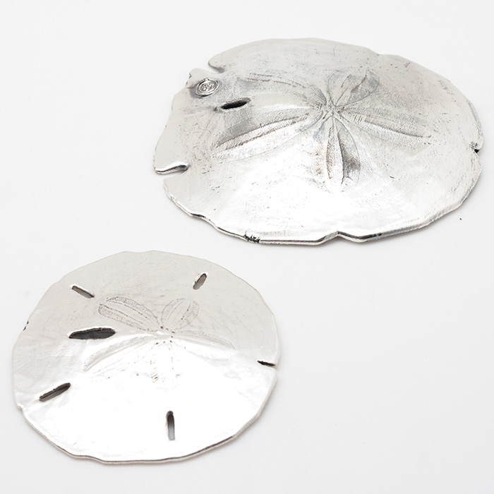 Sand dollar Valentina silvered, 5" diameter. Natural Sand dollar plated in silver. Each piece is unique and created by hand. Creel and Gow has been working with the same atelier in Rome, Italy for over 20 years to make our signature silvered shells. Our workshop has been operated by the same family for generations. For decades, this family has also done restoration work on silver pieces for the Vatican.