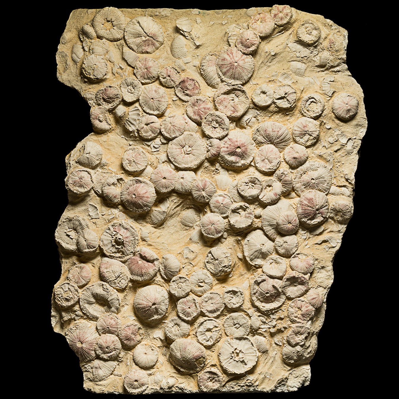 Plate or bed of well-preserved fossilized sea urchins (Echinoids) (Tripneustes parkinsoni) from the Miocene age (15-18 Million years old). Found in Lacoste, France. Vertically mounted on a freestanding, black-painted metal base. Metal supports on the back of the piece also allow it to be wall-mounted. Weighs over 250 lbs.