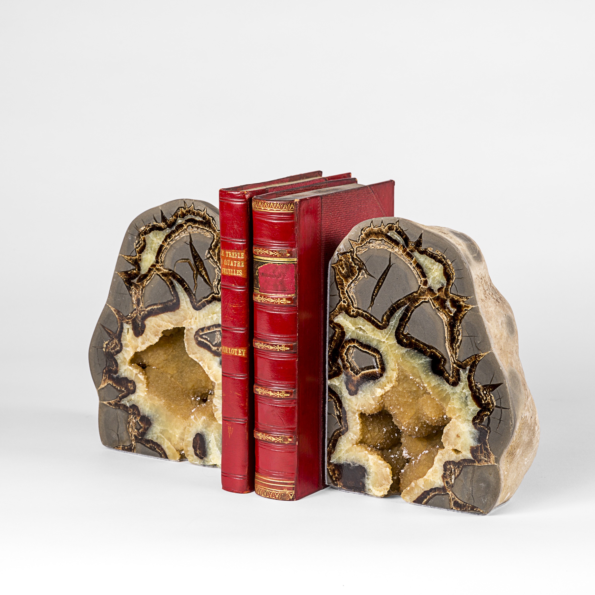 Septarian mineral specimen bookends pair approx 5" x 3" x 6" H. Septarian is a member of the carbonate family, coming in beautiful shades of black, gold, brown and beige.