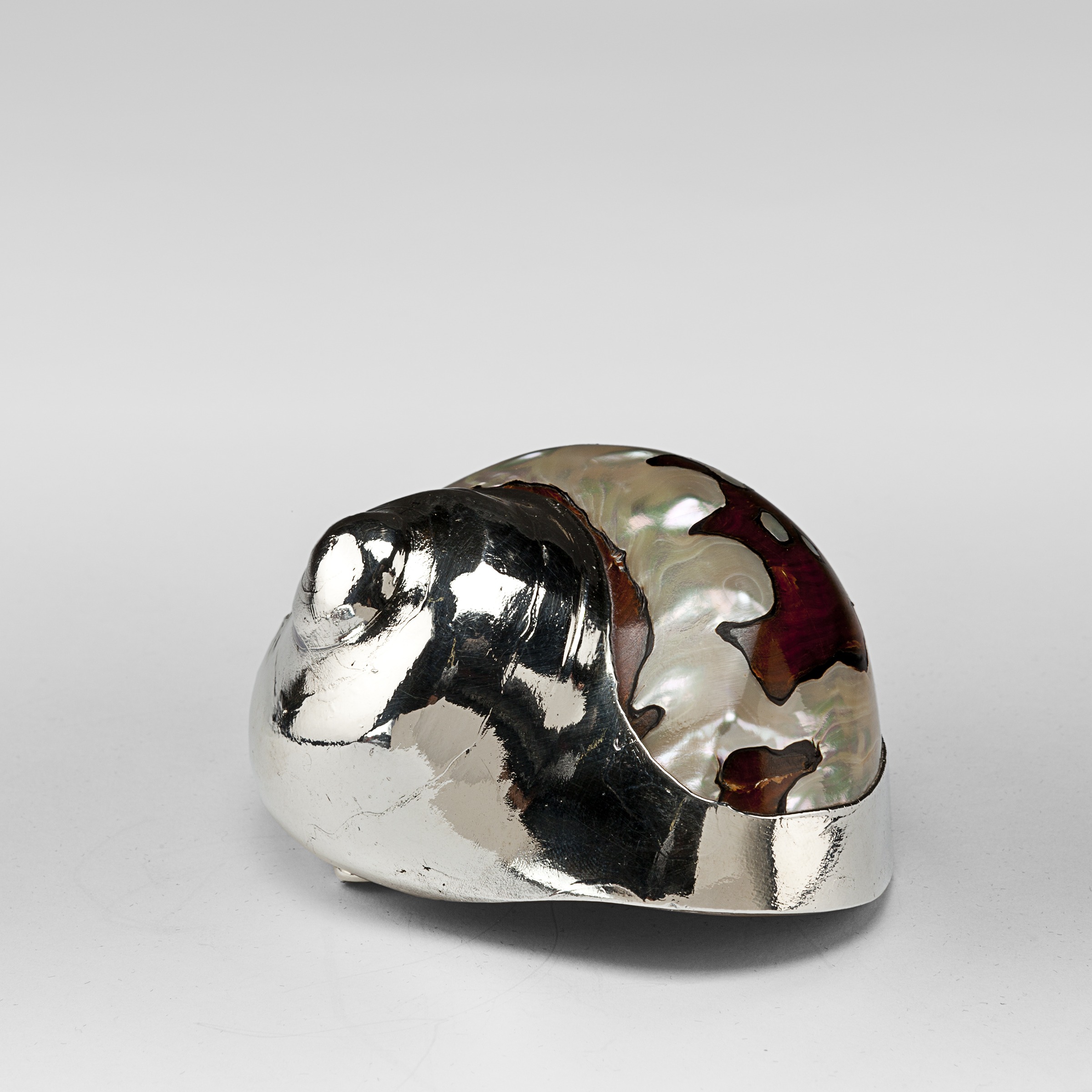 Partially Silvered South African Turban Shell. Available in 3"and 3.5". Each shell is natural and unique. Silvered by hand. Creel and Gow has been working with the same atelier in Rome, Italy for over 20 years to make our signature silvered shells. Our workshop has been operated by the same family for generations. For decades, this family has also done restoration work on silver pieces for the Vatican.